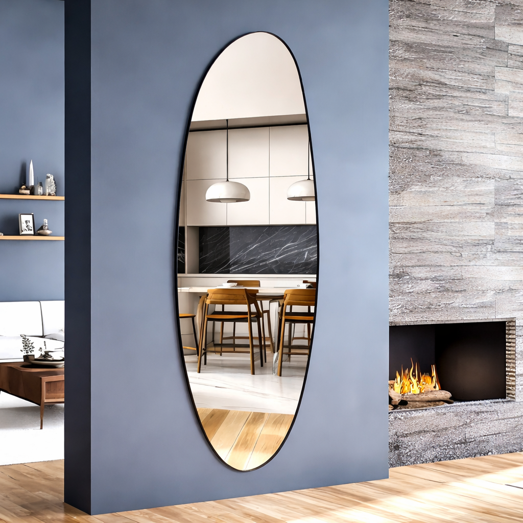 מראה אליפסה מתכת פרופיל דק צבע שחור תלייה לאורך ולרוחב S-XXL