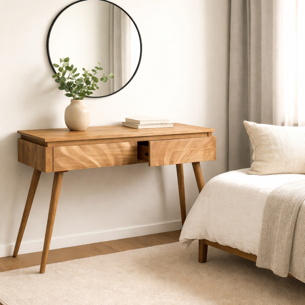 קונסולה עץ מלא טבעי עם שתי מגירות ובסיס מתכת שחור