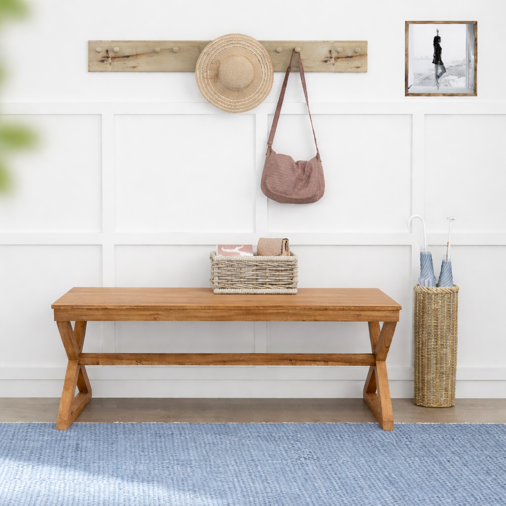 ספסל עץ מלא עם ריפוד פשתן טבעי /כהה