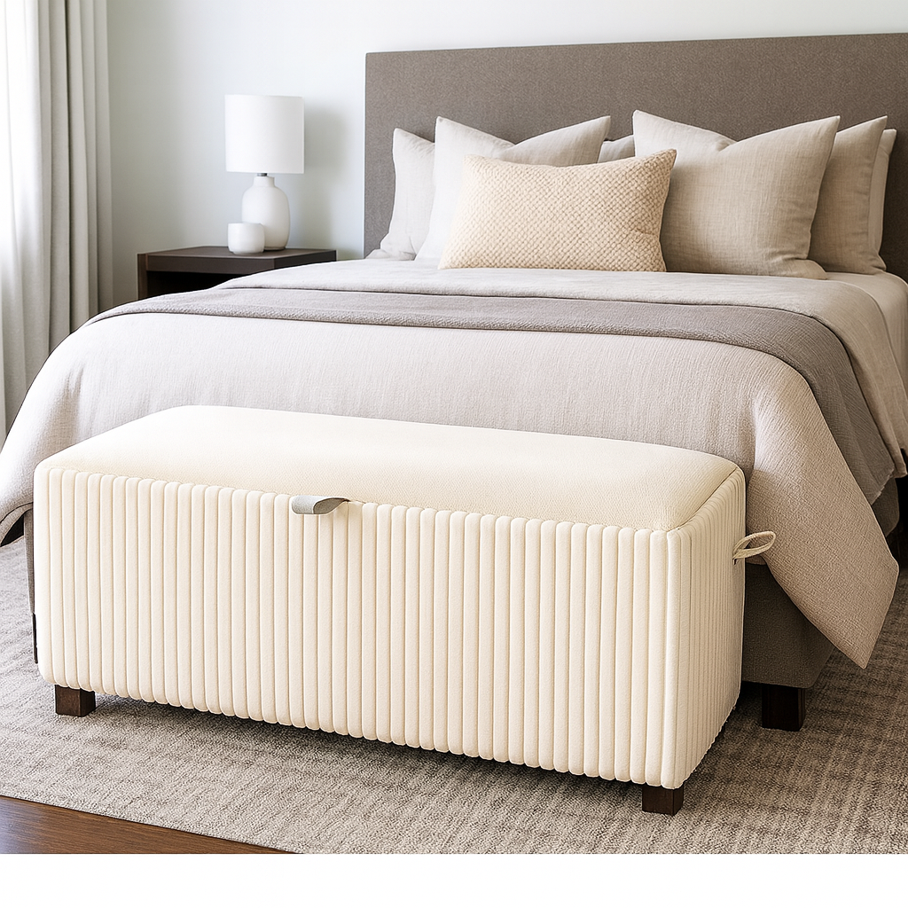 הניחו את ההדום בקצה המיטה ליצירת מראה מלון יוקרתי. בחדר ילדים — הוא יכול לשמש גם כמושב וגם כפתרון אחסון סמוי למשחקים ושמיכות, לשמירה על חדר מסודר ורגוע.