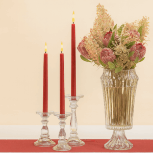 עיצוב נקי עם כלים שקופים, אגרטלים לבנים בעלי טקסטורה עדינה וכוסות ירוקות שמוסיפות חיות.