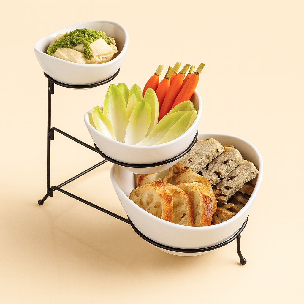 סט אירוח מודרני ואלגנטי הכולל שלוש קעריות קרמיקה לבנות באורכים שונים, מונחות על גבי סטנד מתכת שחורה יציב בתצורה מדורגת. העיצוב המדורג לא רק חוסך מקום על השולחן אלא גם מעניק הגשה מרשימה, נגישה ונוחה לכל סועד.