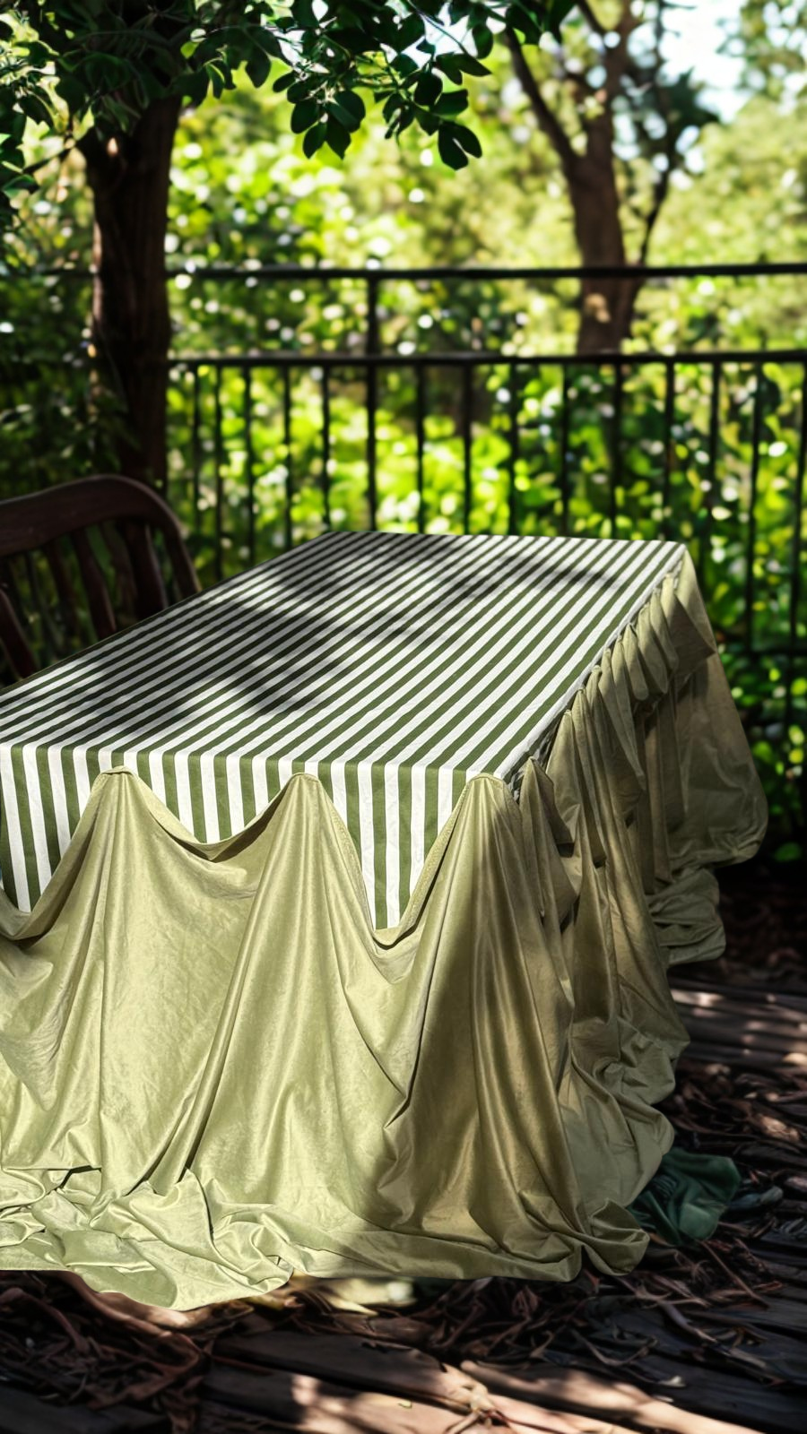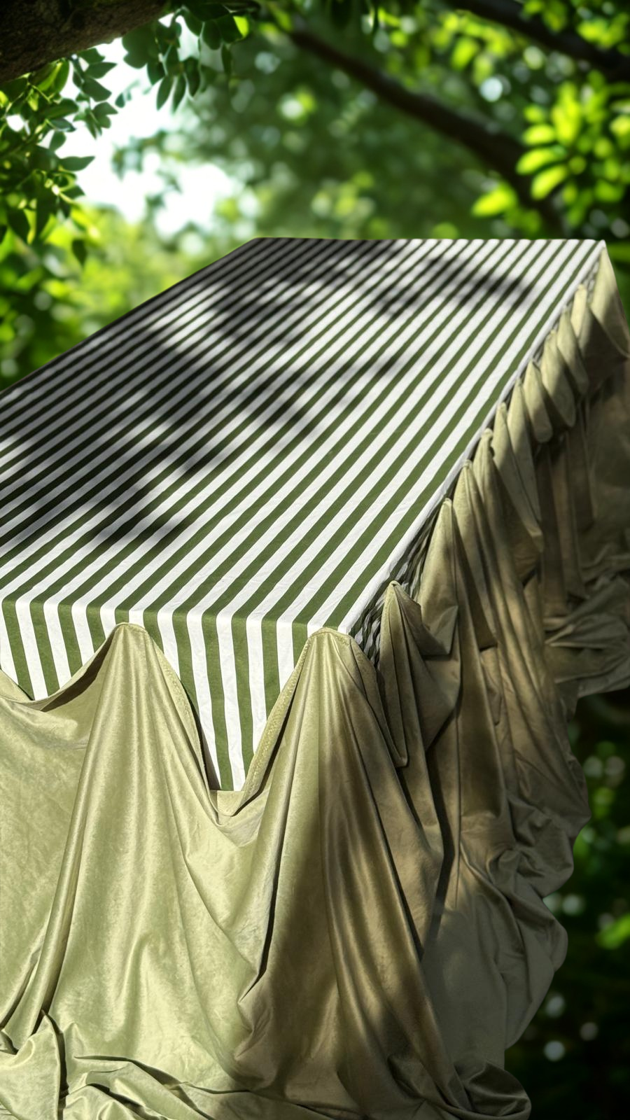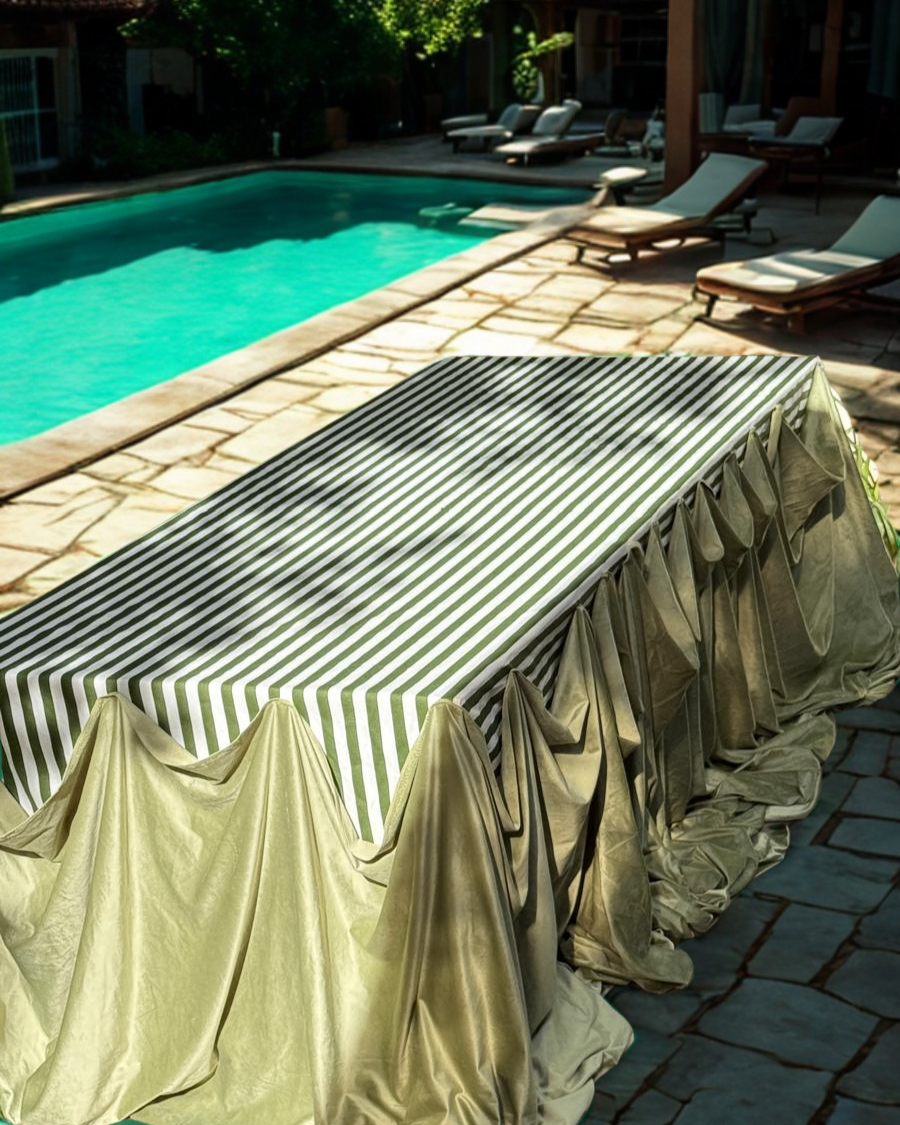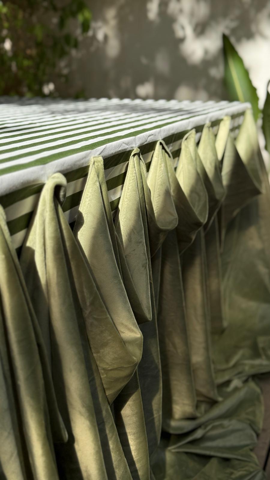 הפסים הירוקים־לבנים יוצרים תחושה של רעננות ועידון, בעוד שהקיפולים הירוקים העוטפים את החזית מוסיפים עומק ודרמטיות עיצובית. שילוב זה מעניק לשולחן מראה רך אך מרשים, עם נוכחות של עיצוב אירוע יוקרתי. סגנון מפה זה מתאים במיוחד לאירועי צהריים בגינה, שולחנות בופה מעוצבים או ארוחות חג עם טאץ’ מודרני ואלגנטי.