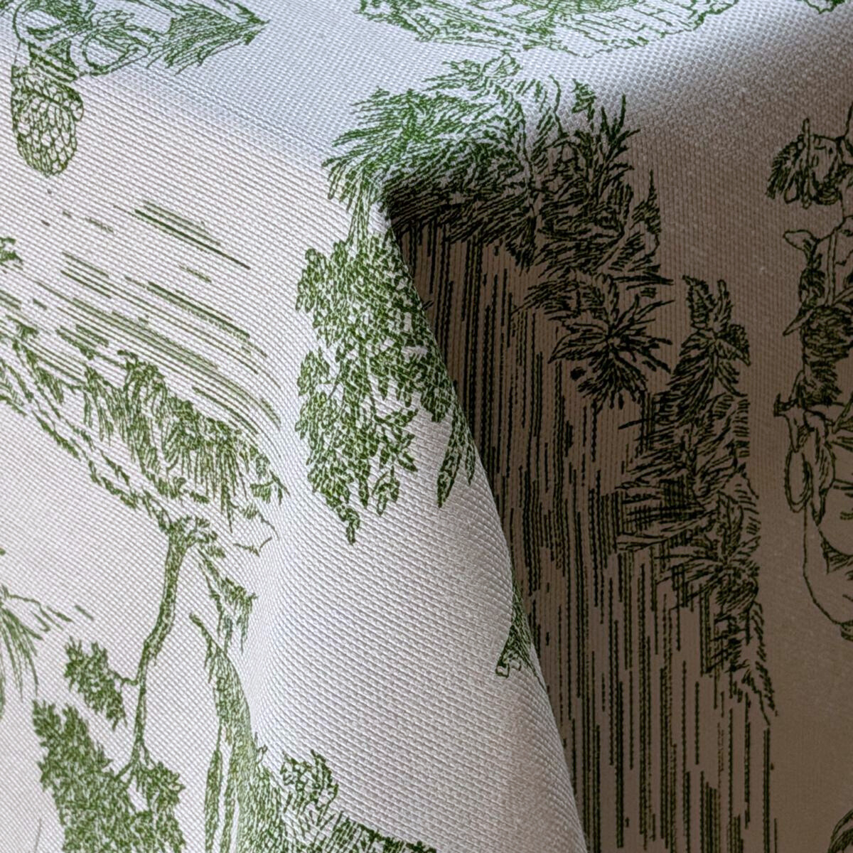הדוגמה הירוקה בהשראת סצנות טבע קלאסיות בסגנון Toile de Jouy על רקע שמנת יוצרת עיצוב על־זמני, המתאים לאירוח יוקרתי, שולחן שבת או אירועים חגיגיים. הקונטרסט בין הרקע הבהיר להדפס הירוק מעניק תחושת עומק וסטייל שמרוממת את מראה השולחן כולו.
