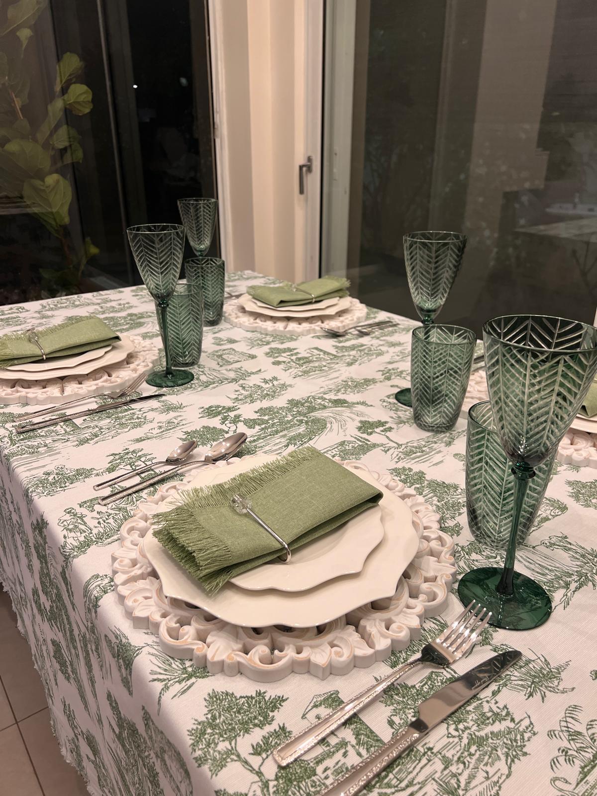 מפה יוקרתית בהשראת סגנון Dior הקלאסי, בעיצוב על־זמני בגווני ירוק ולבן. ההדפס האמנותי מדמה נופי טבע רכים ואלגנטיים, המעניקים לשולחן תחושת רוגע, רעננות ואלגנטיות אירופית במראה מושלם.