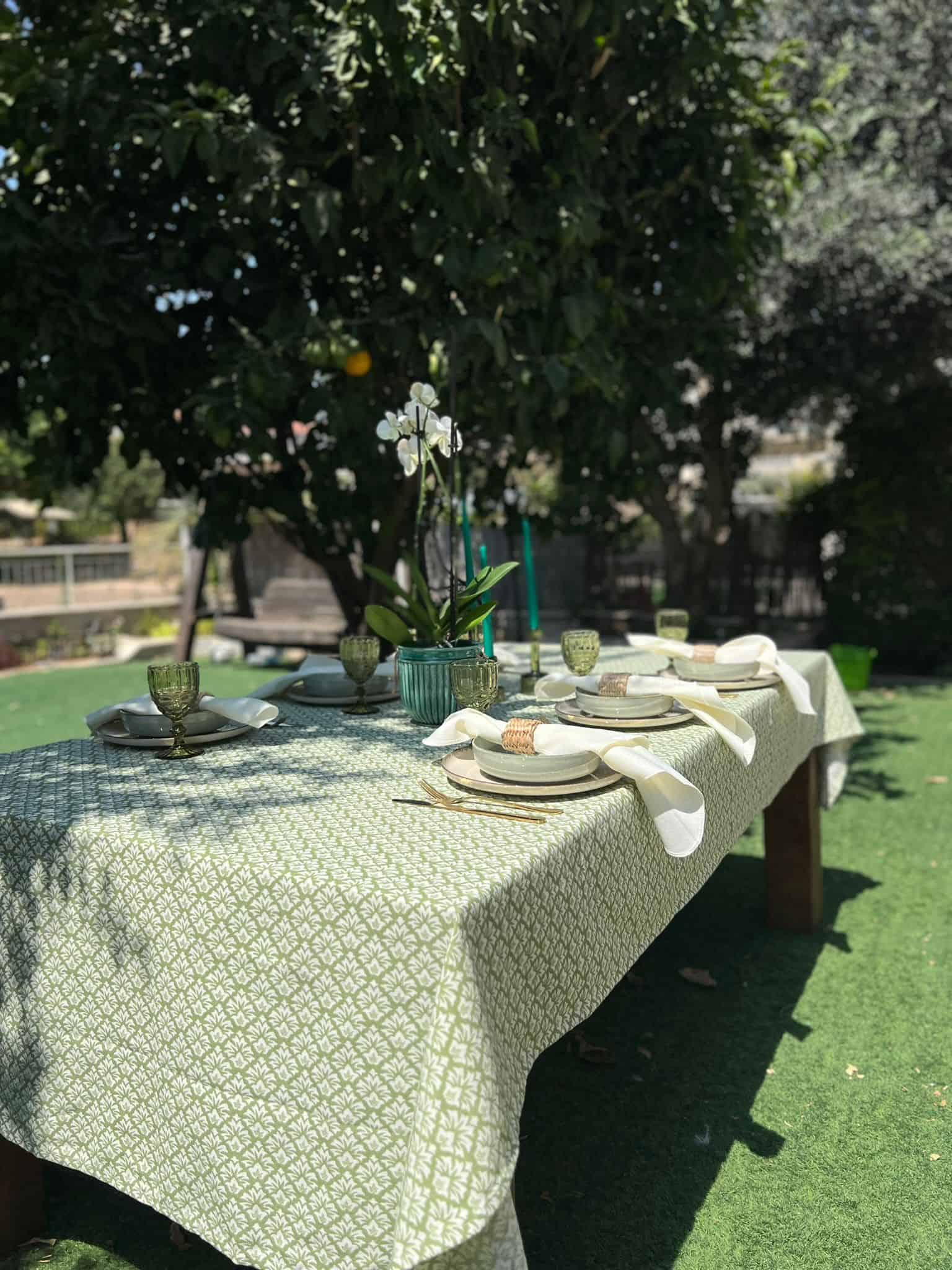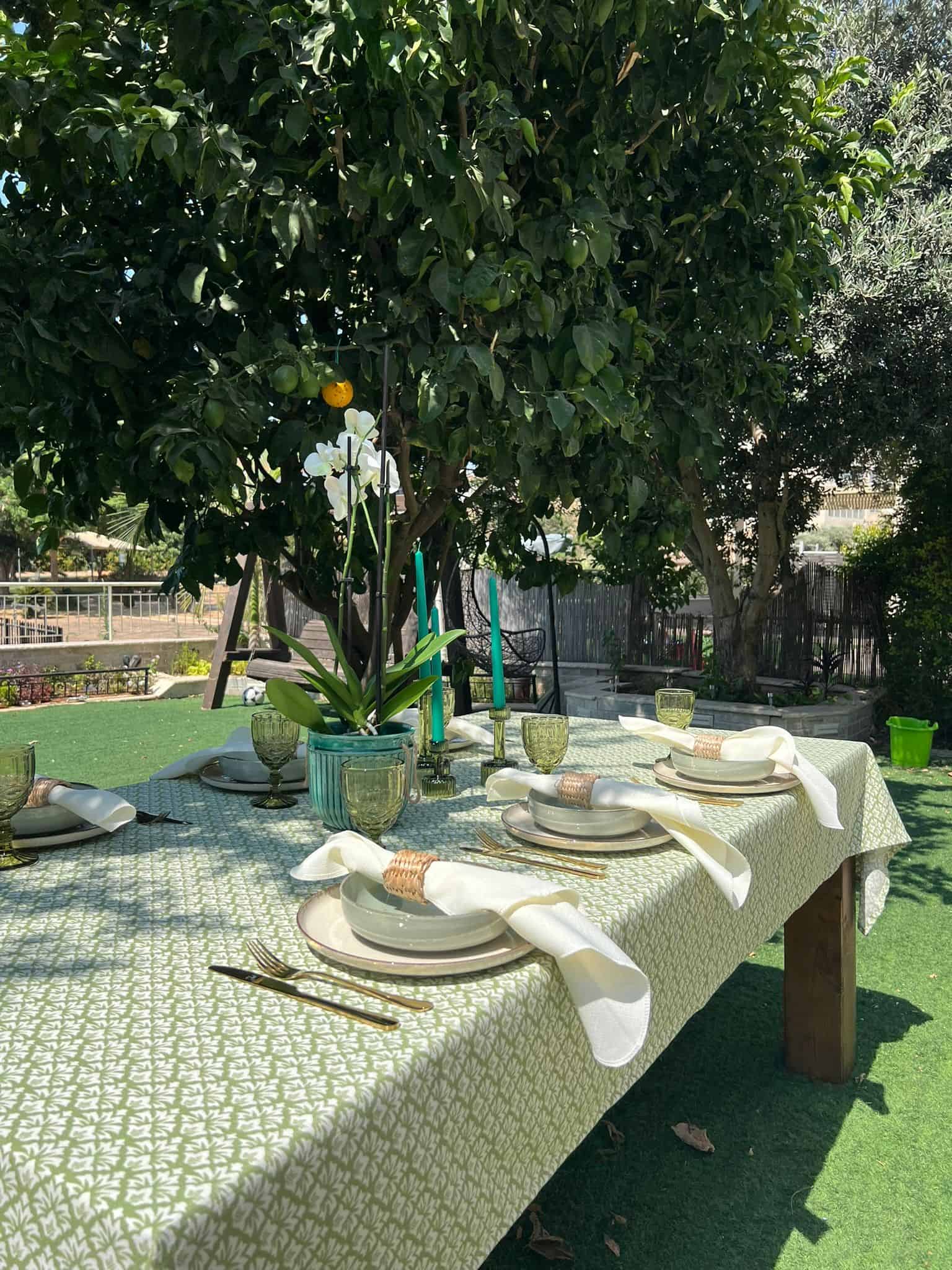 שלבו את מפת ונזי ירוקה עם פרחים טבעיים, נרות בגווני שמנת וכלי זהב עדינים – ליצירת שולחן חמים, אלגנטי ומלא תחושת רוגע והרמוניה טבעית.