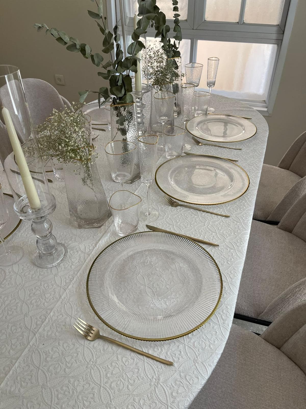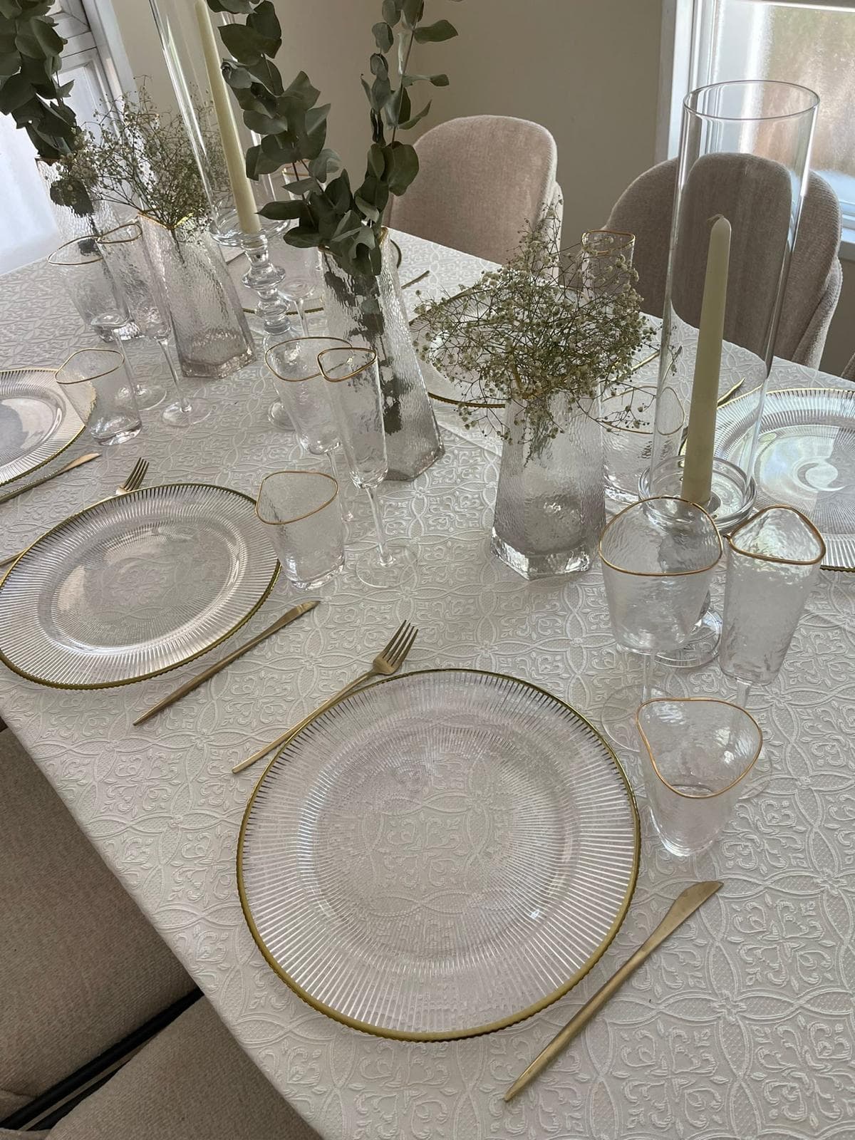 שלבו את מפת השמנת הרקומה עם כלי אוכל שקופים או לבנים, סכו״ם מוזהב ונרות בגווני קרם או ירקרק־זית ליצירת שולחן מעודן, טבעי ומואר – מראה שמשלב יוקרה עם חמימות מושלמת.