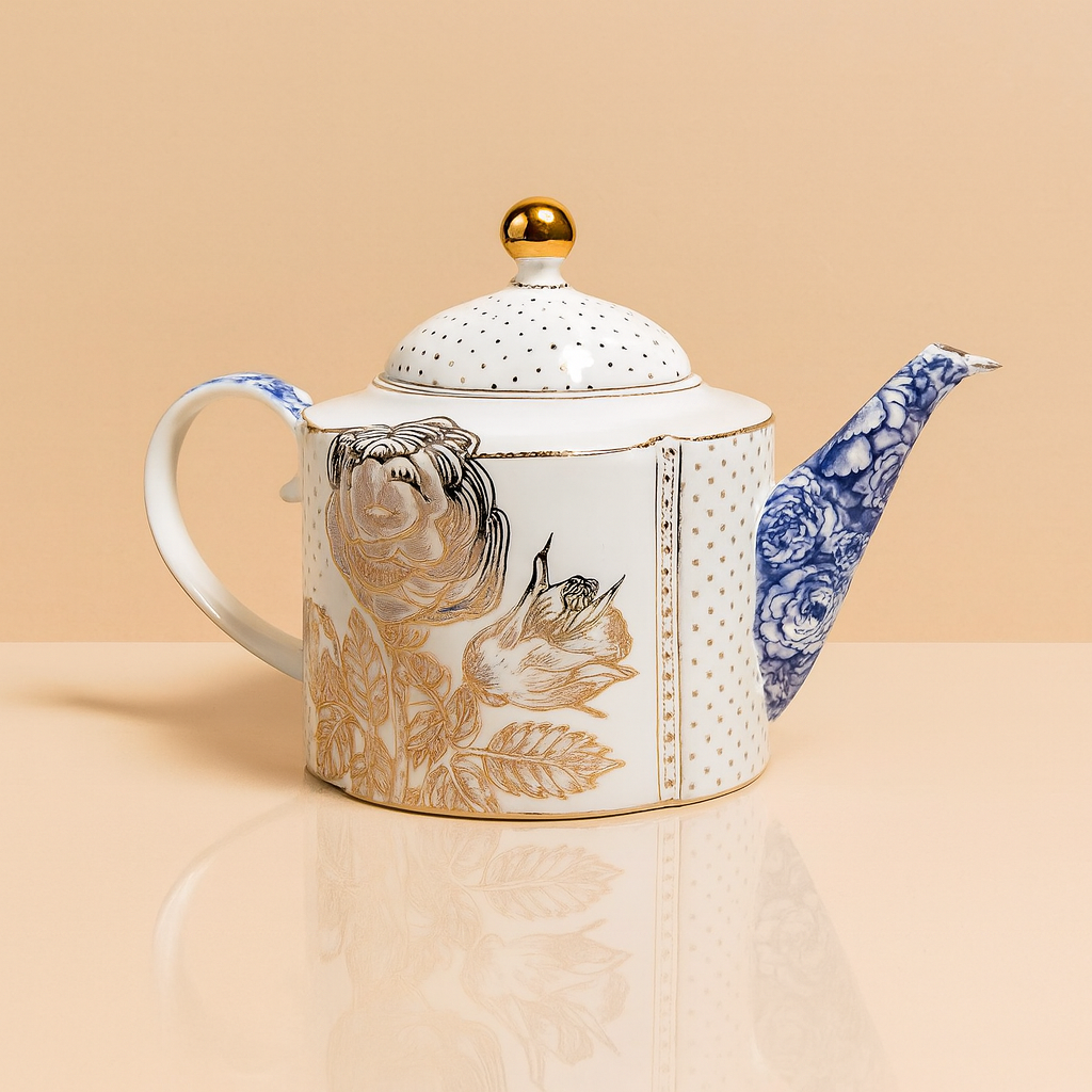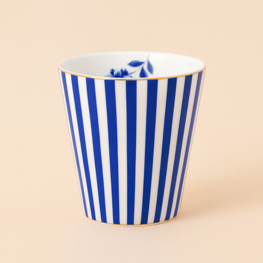 השפה הפנימית המעוטרת בדוגמת פרחים כחולים מעניקה עומק ויוקרה, בעוד שהחלק החיצוני בצבע כהה ומרקם אלגנטי מוסיף ניגוד מושלם למראה השולחן.