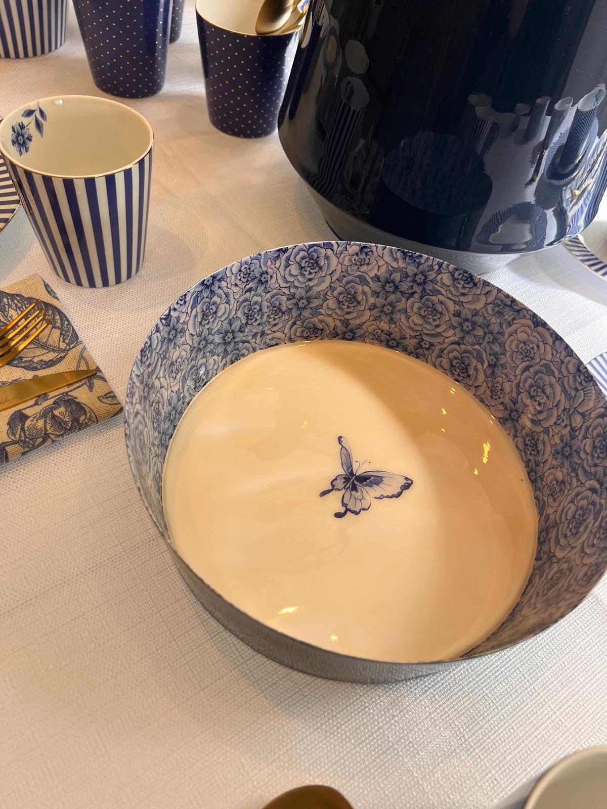 הקערה מעוטרת בעיצוב פרחוני מרהיב בגווני כחול ולבן, ובמרכזה פרפר עדין המשווה לה מראה רומנטי ואצילי.